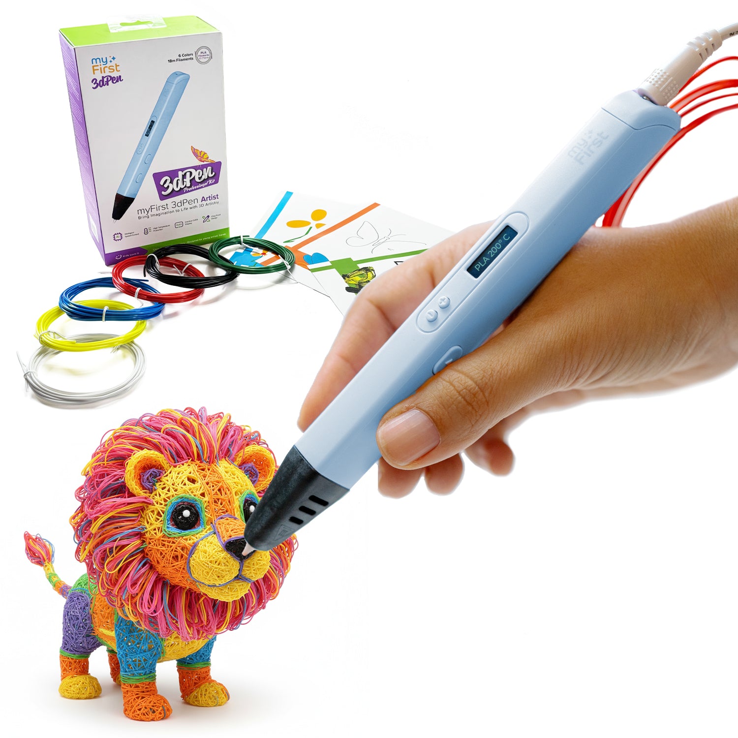 The myFirst 3dPen Artist uses PLA filament, a safe and biodegradable plastic commonly used in 3D printing. Compared to other filaments used in 3D printing, PLA melts at a lower temperature. This makes it ideal for 3D pens, as the pen itself doesn't need to get extremely hot.