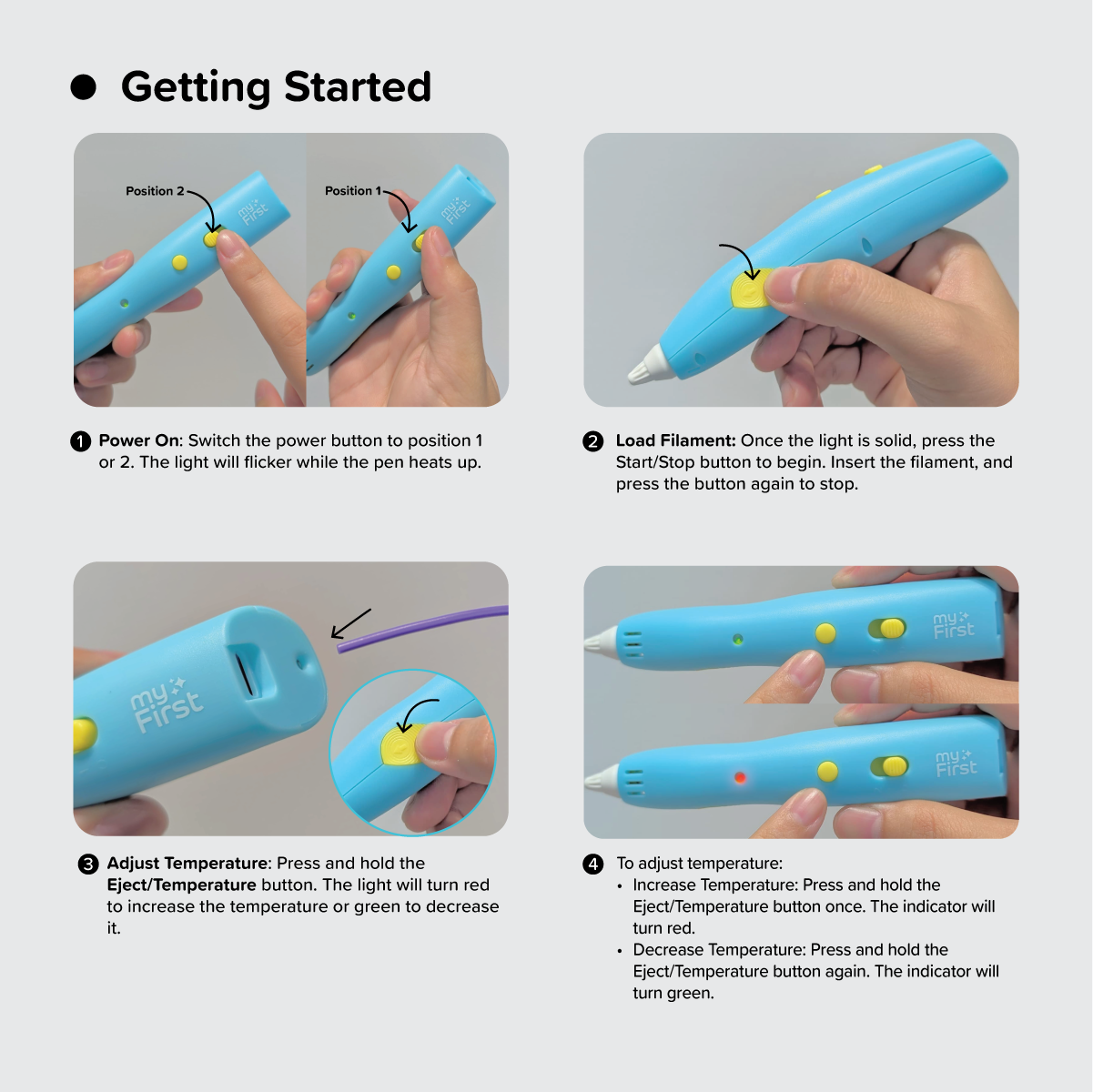 Our myFirst 3dPen Make comes with PCL filament that's non-toxic, odorless, and eco-friendly. This clever material melts at a low, child-safe temperature and your designs solidify in just 10 seconds, so there's less waiting and more playing!