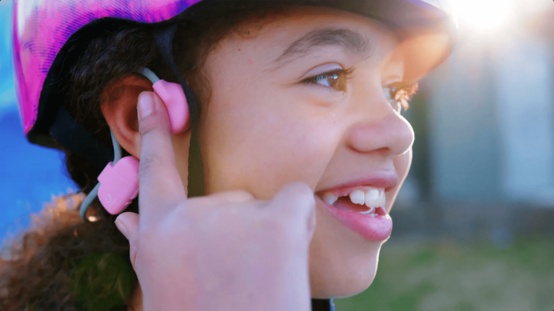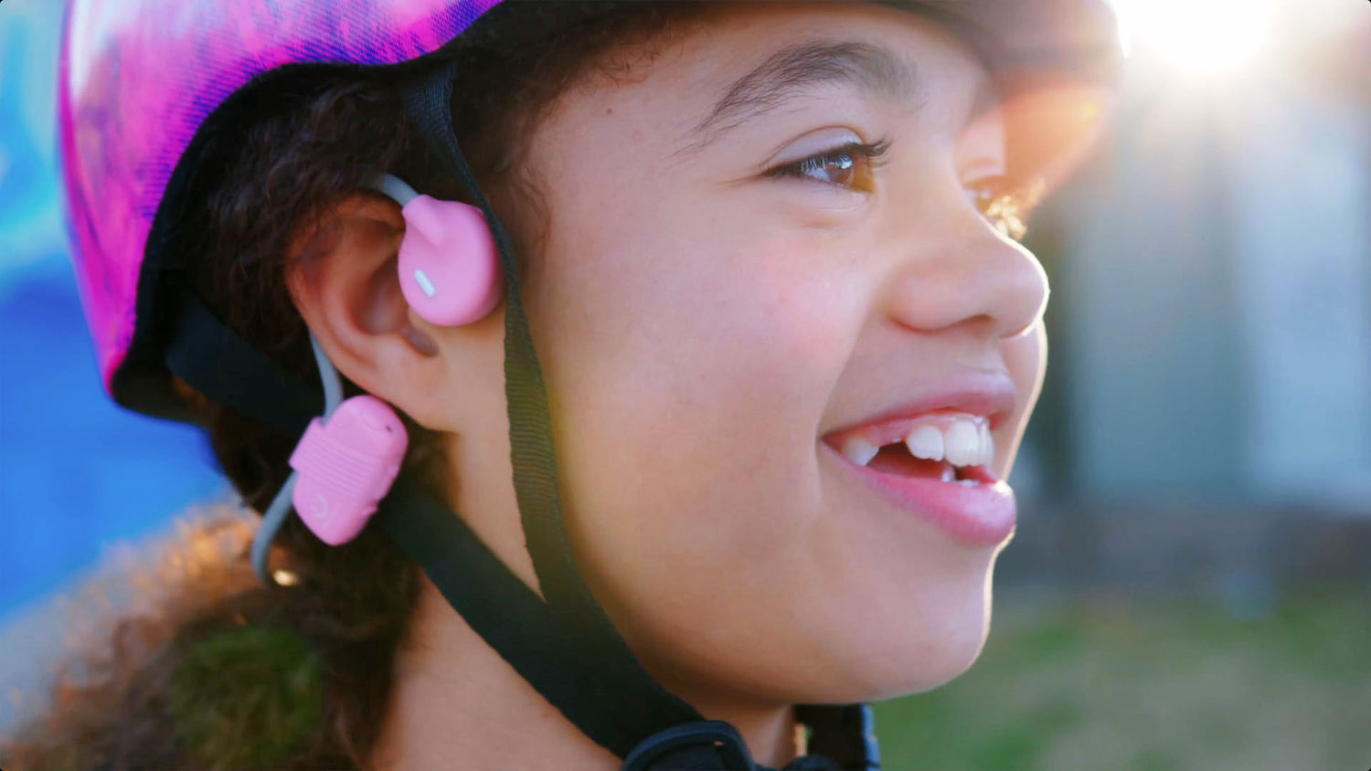 Transmitting sound via the cheekbones, allowing kids to enjoy music while staying alert outside.